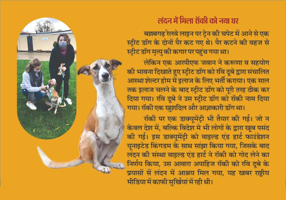 The constable, Chanderpal Tanwar, rushed her to a shelter home run by People For Animal Trust (PFA) Faridabad, where she was operated on. Rocky battled for life over the next few months.